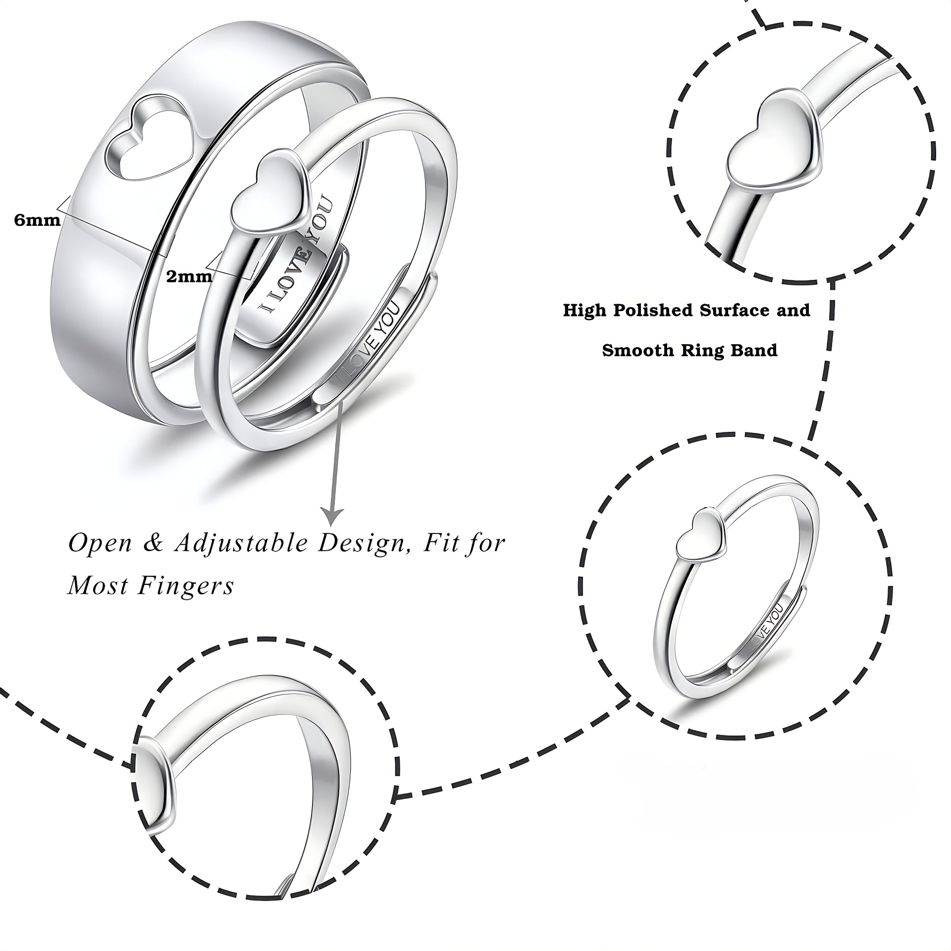 Each ring boasts an innovative opening mechanism that allows for effortless size adjustment, ensuring a perfect fit for both partners.
